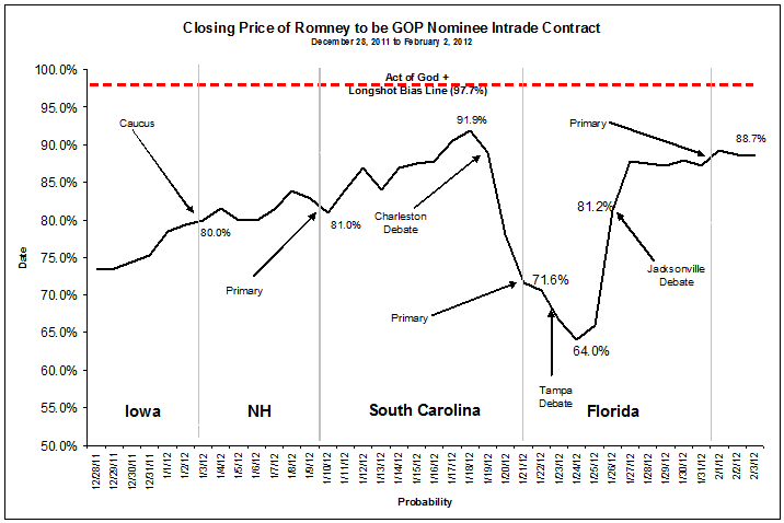 Still, there are a few other market distortions worth noting here: for instance, the market might itself have an influence on the outcome of the race, and thus partisan backers of one candidate or another might have reasons to manipulate it. I don't think a lot of people are looking to Intrade to see if the race is over, but would it really be that bad of an investment for the Gingrich or Santorum campaign to spend a few thousand dollars driving down the price of Romney? It's not a huge-volume market. It couldn't hurt. If there are voters or journalists out there who are using Intrade as a cue, then it might actually be a very smart strategy.
