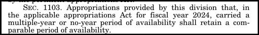 Note that this is two-year money (we are looking at the FY2024 appropriations, which would normally run through September 30, 2024 but here is being provided to run through September 30, 2025. And note that the full-year CR we are currently operating under, which provides funds on the same basis as the FY2024 act, provides that multi-year money continues to be multi-year money: