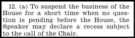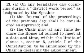 The problem with these provisions is that they create scenarios where the full House cannot procedurally overrule the Speaker. Once the Speaker declares the House adjourned or in recess, there’s no way to challenge that action. And when the Speaker calls the House back into pro forma session (or back from recess) in order to fulfill the constitutional obligation, he/she can simply use these authorities again to go right back into adjournment/recess. Again, without the ability of a majority of the House to object.