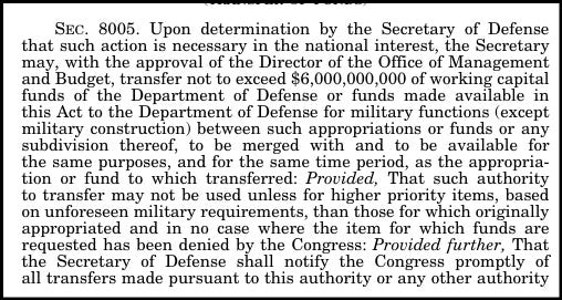 There are dozens of transfer authorities in the Defense appropriations act. Here are some examples: