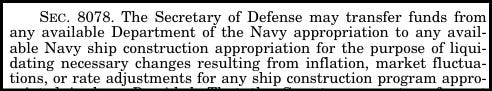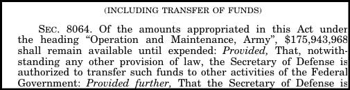 Not all transfers could get to the military personnel accounts—the last example above, for instance, limits the transfer to Navy ship construction—and the terms of the transfers are often further restricted by law. If you look at the second example, it limits its applicability upon transfer to the “same time period…as the appropriation or fund to which transferred,” which might preclude it from being used in an account that only has expired FY2025 money and no current FY2026 funding.
